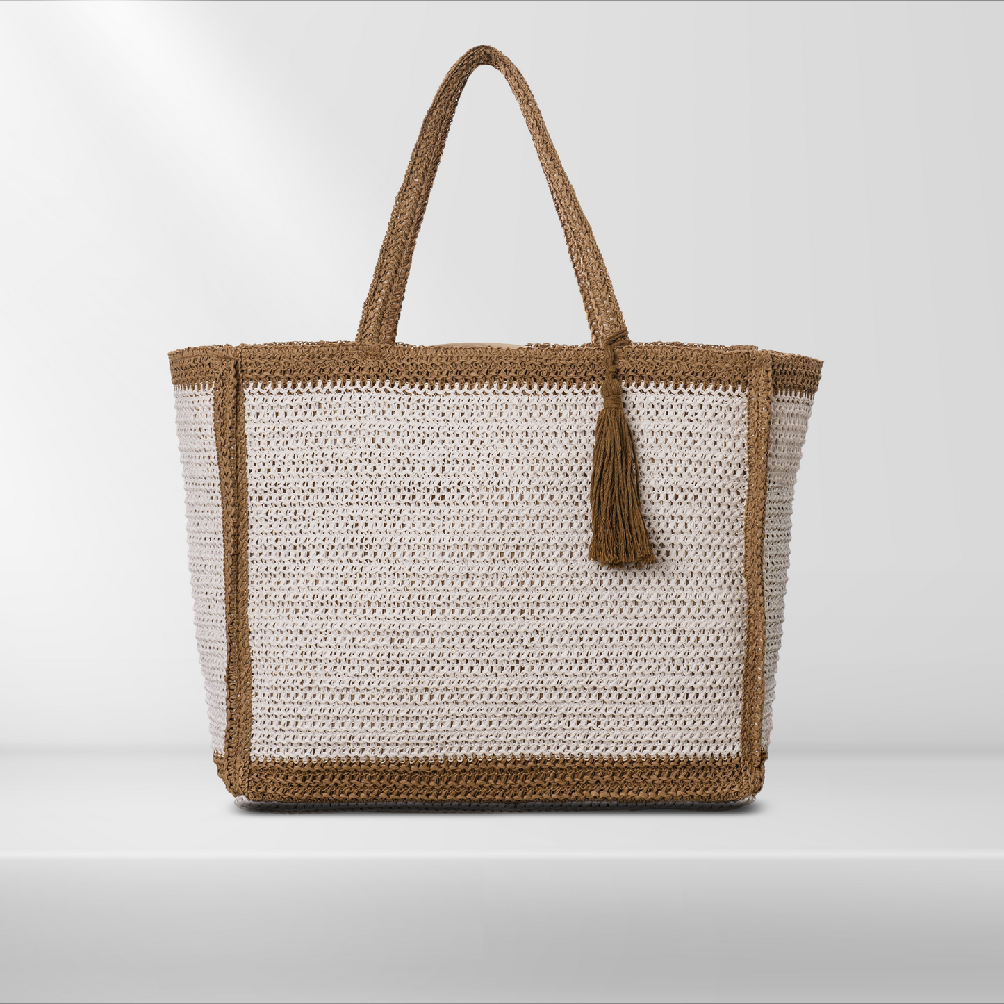 The Aura Bag is the perfect combination of delicacy and functionality. Crafted from crochet-effect material and embellished with a tone-on-tone tassel, it is designed for those who love natural style with a touch of refinement.