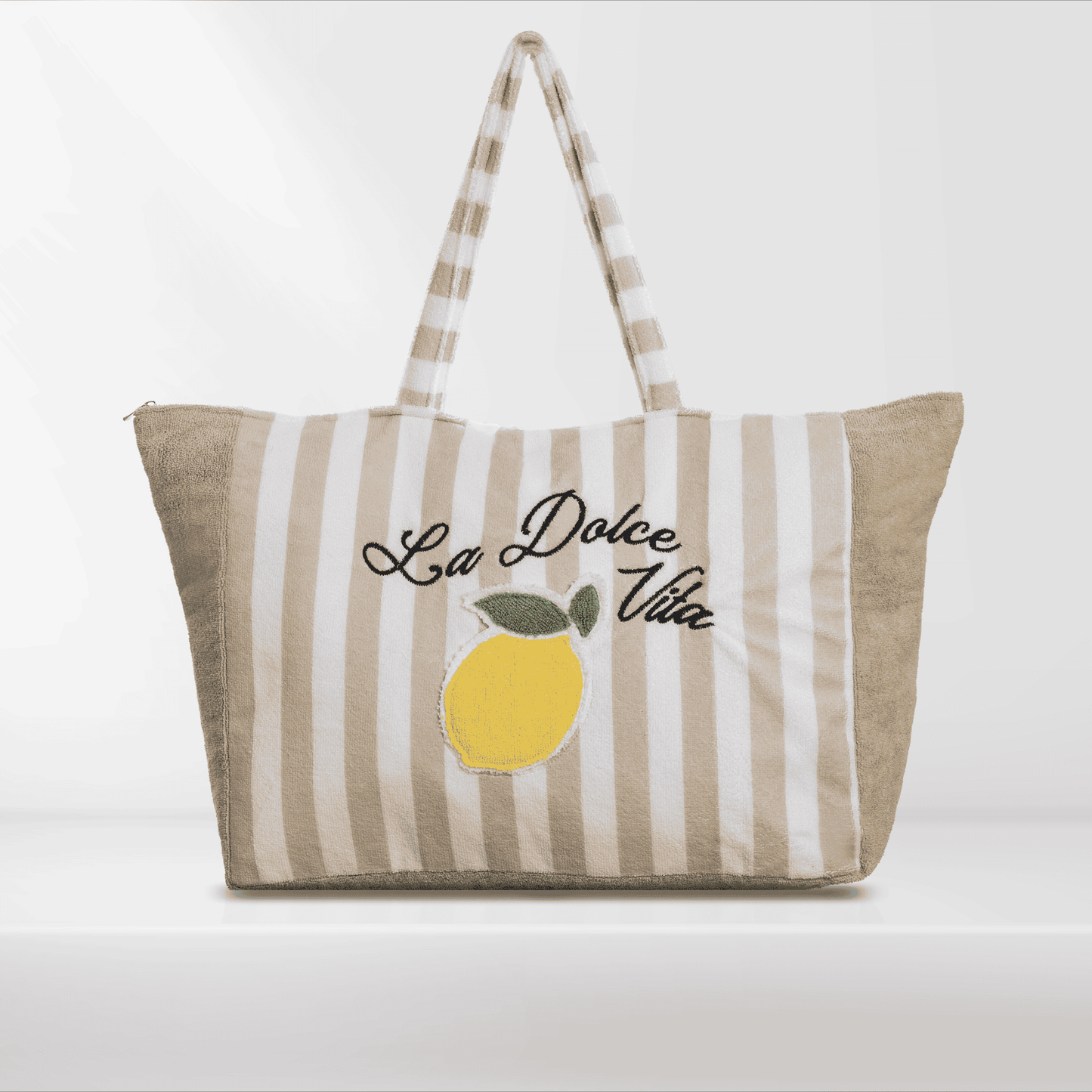 La Maxi Bag in spugna a strisce verticali è l'accessorio ideale per accompagnare l’estate con stile ed eleganza. Realizzata in morbido tessuto di spugna, è caratterizzata da un design fresco e solare, impreziosito dal ricamo "La Dolce Vita" e dal motivo limone, icona dello stile mediterraneo.