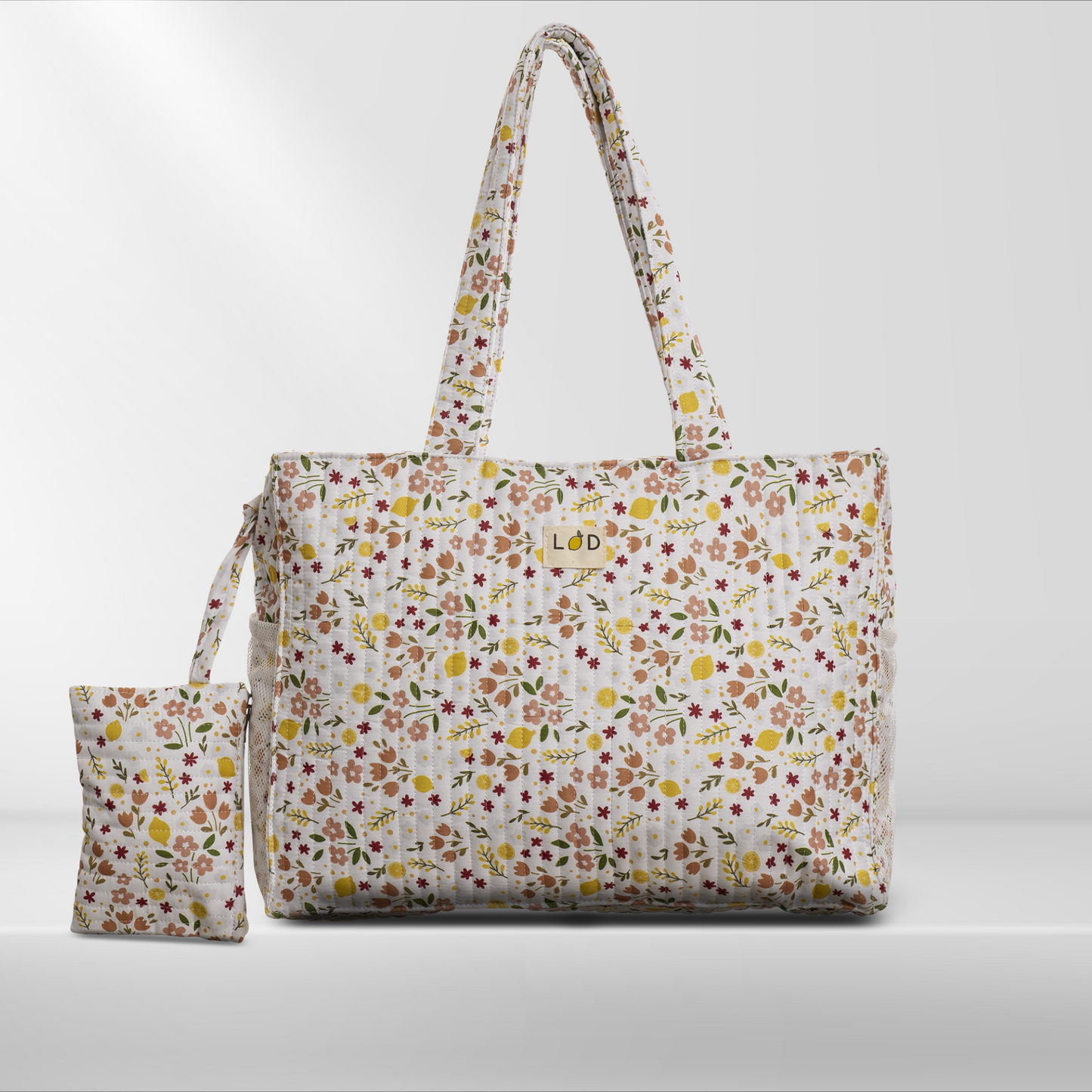Realizzata in tessuto leggero e trapuntato, si distingue per la sua stampa vivace a tema agrumato: limoni, rami verdi e accenti naturali su sfondo chiaro.