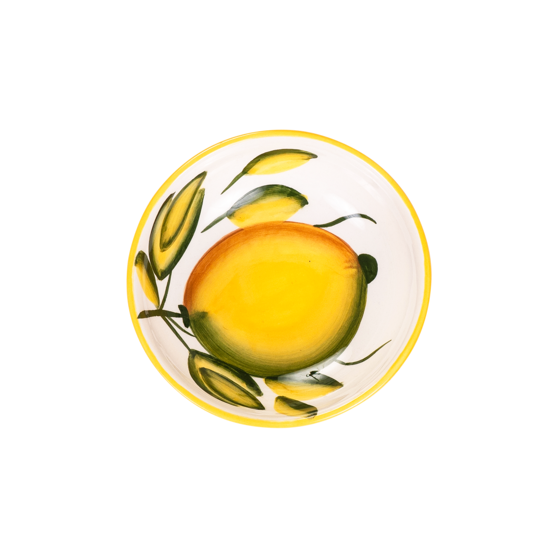 Solare e super versatile: questa ciotola tonda in ceramica da 8,9 cm porta in tavola tutta l’energia del Mediterraneo con il suo decoro limone e il bordo giallo. È perfetta per servire olive, frutta secca, salsine, spezie o piccoli dolci, ed è ideale per completare una mise en place estiva o una tavola in stile costiero.