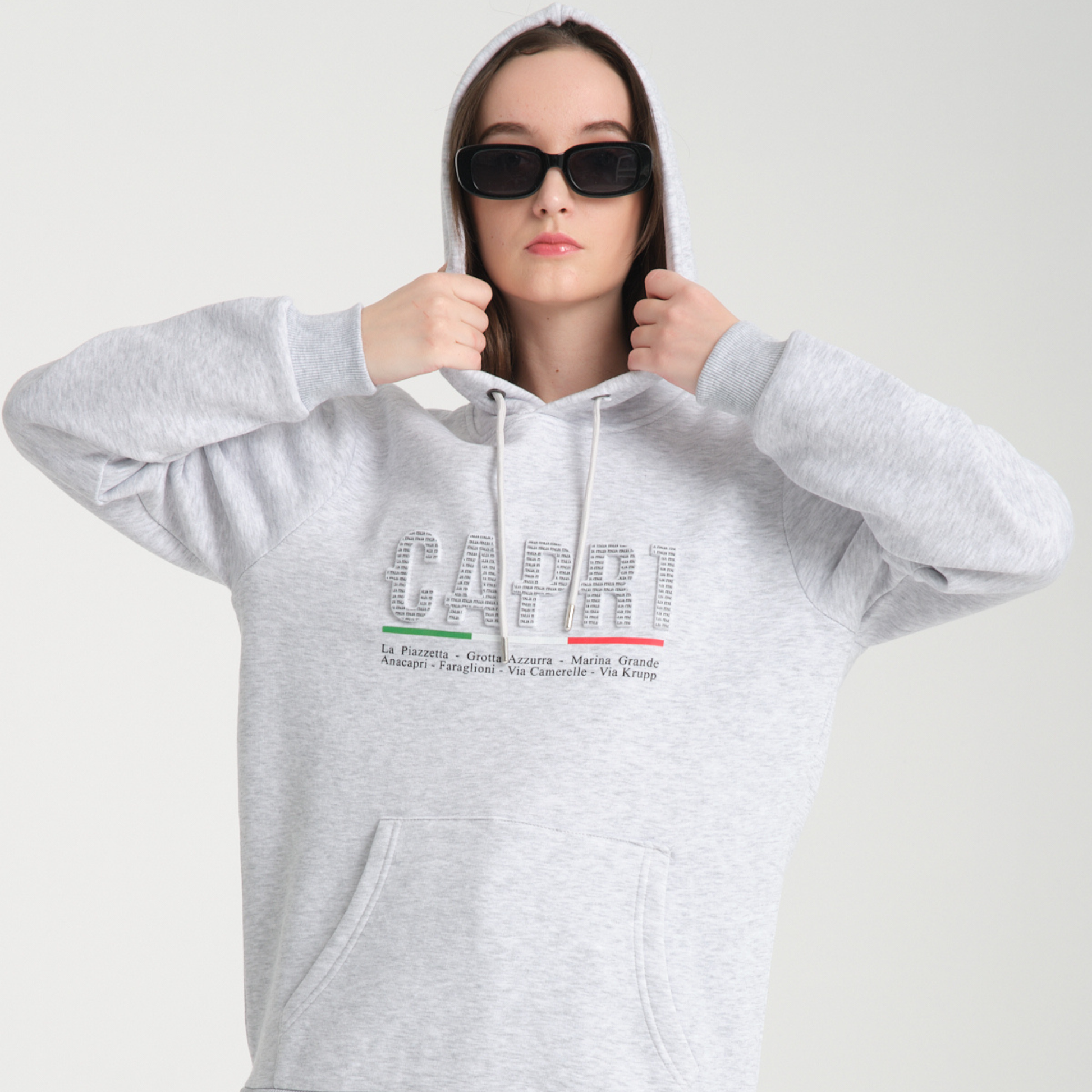 La Felpa con Cappuccio Hoodie Capri Locations Snow Melange celebra l’isola di Capri attraverso un design elegante e ricco di significato. Sul petto, la scritta CAPRI è accompagnata dai nomi dei luoghi iconici dell’isola — dalla Grotta Azzurra ai Faraglioni, da Anacapri a Marina Grande — in un omaggio grafico che unisce stile e identità italiana.