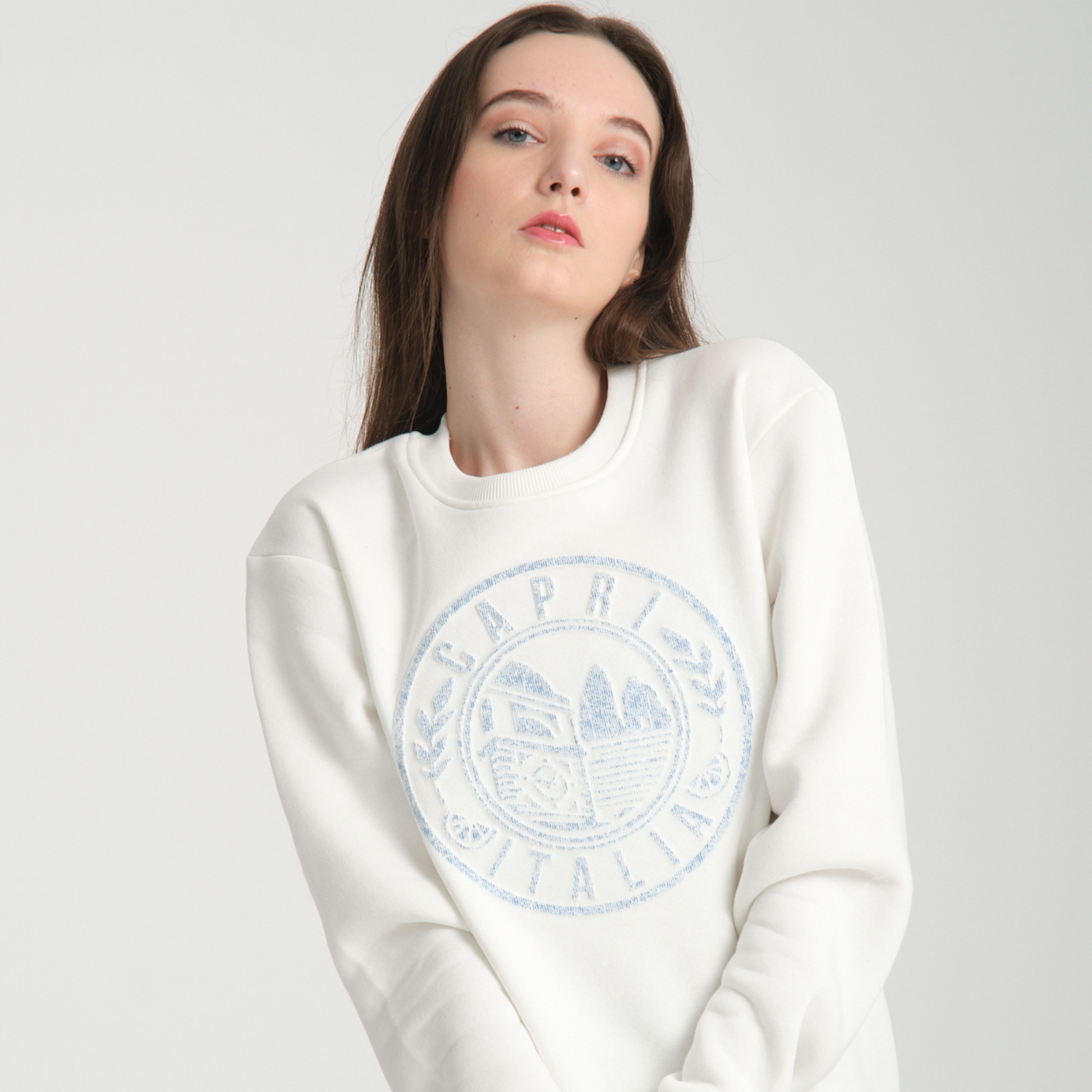 La stampa “CAPRI ITALIA” tono su tono, con effetto vellutato azzurro, aggiunge un tocco sofisticato e contemporaneo, rendendo questa felpa un capo distintivo e versatile.