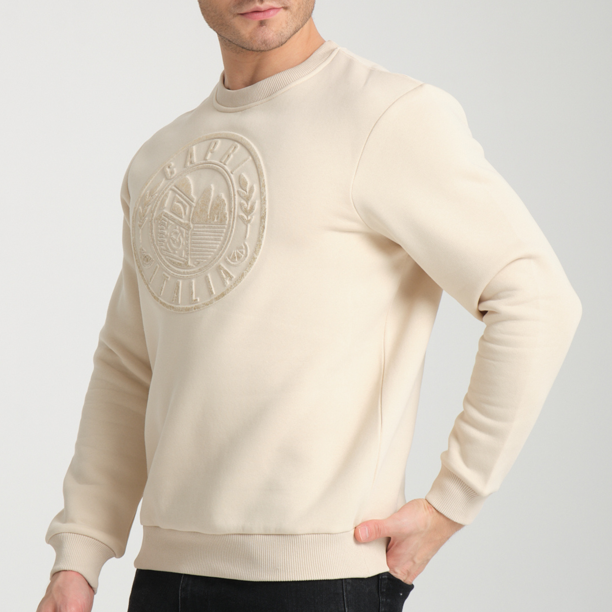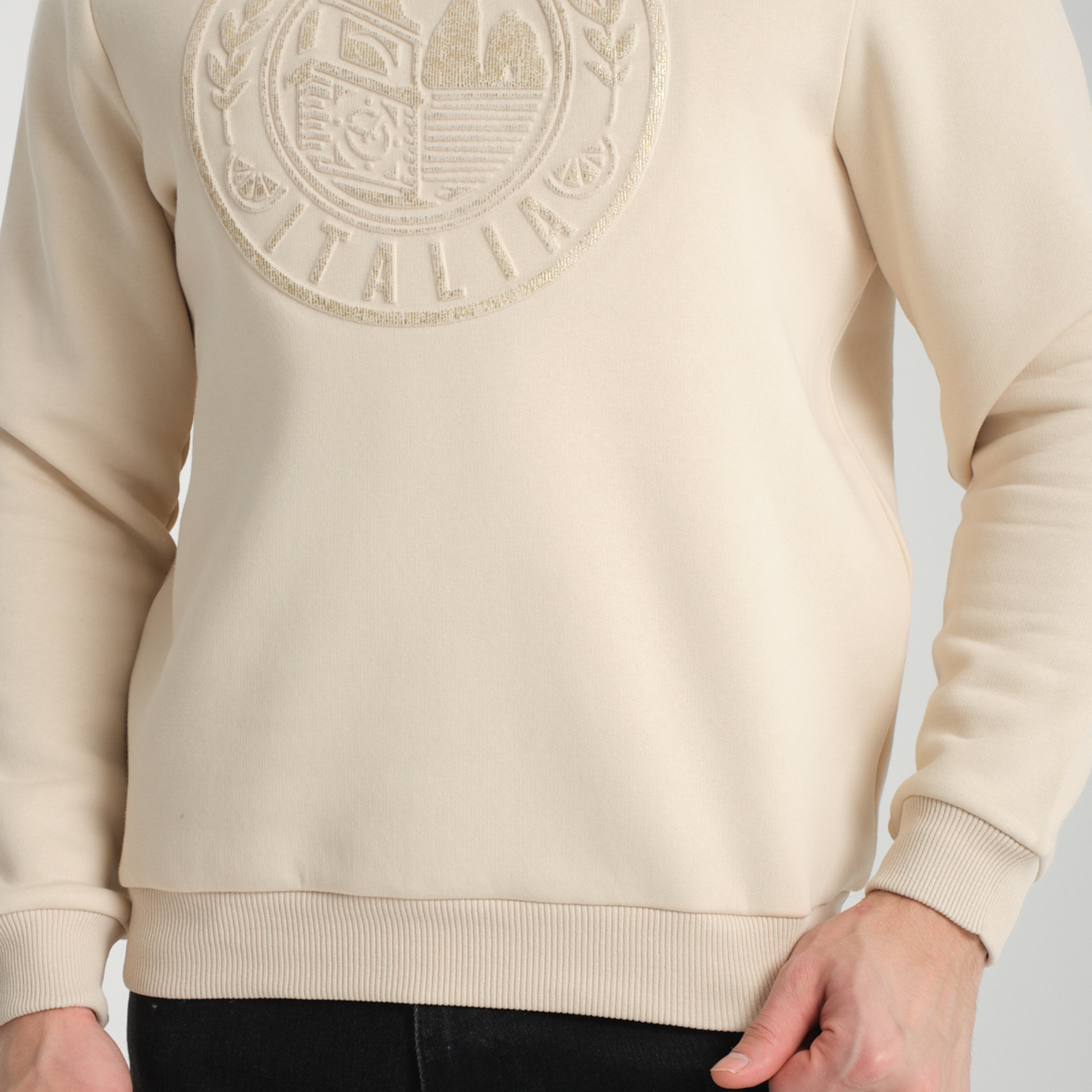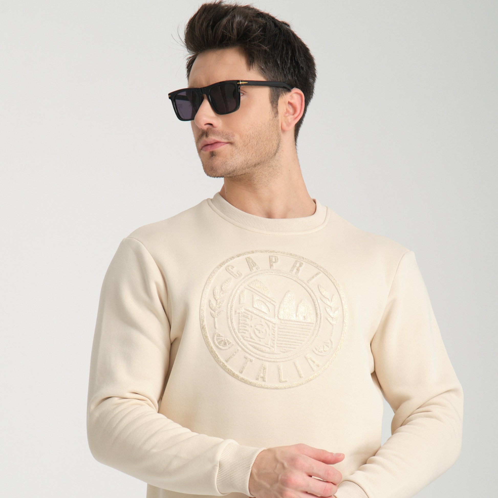 Il logo “CAPRI ITALIA” tono su tono, ricamato in rilievo sul petto, dona un effetto raffinato e moderno, rendendo questa felpa un capo iconico, perfetto per outfit casual o più ricercati.
