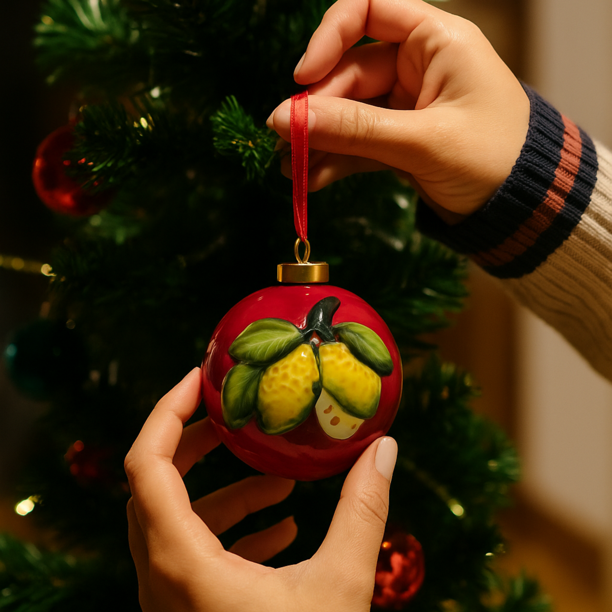 Pallina di Natale in Ceramica Rossa con Limoni 3D - 8,5 cm - SF140