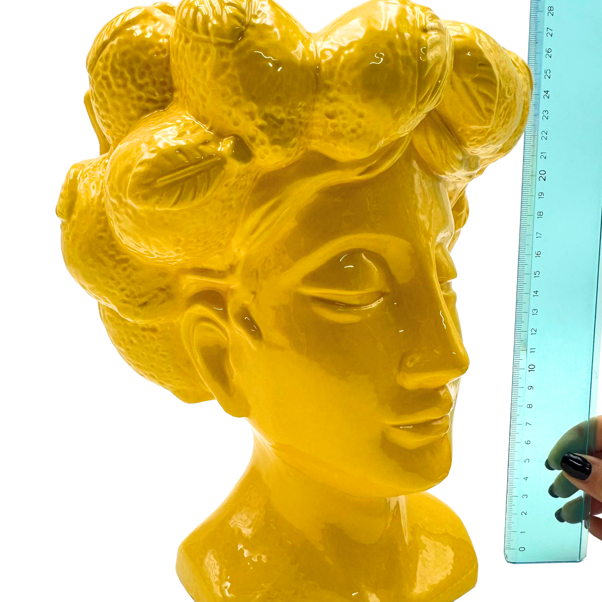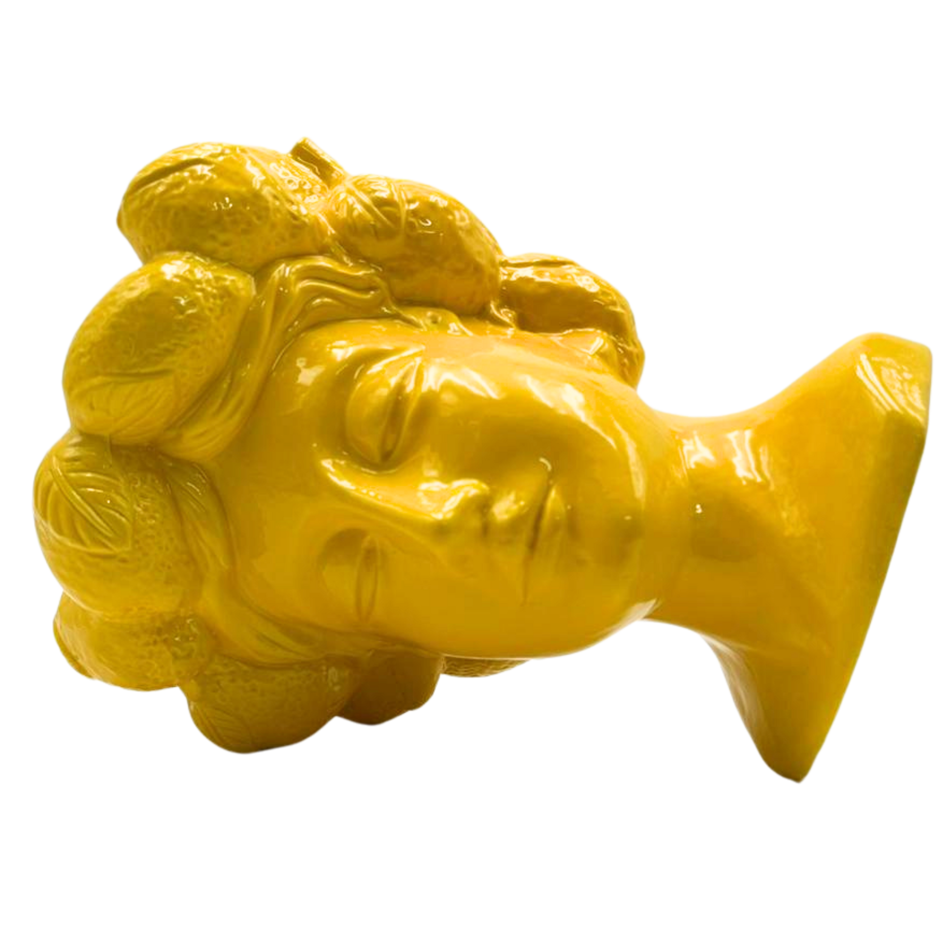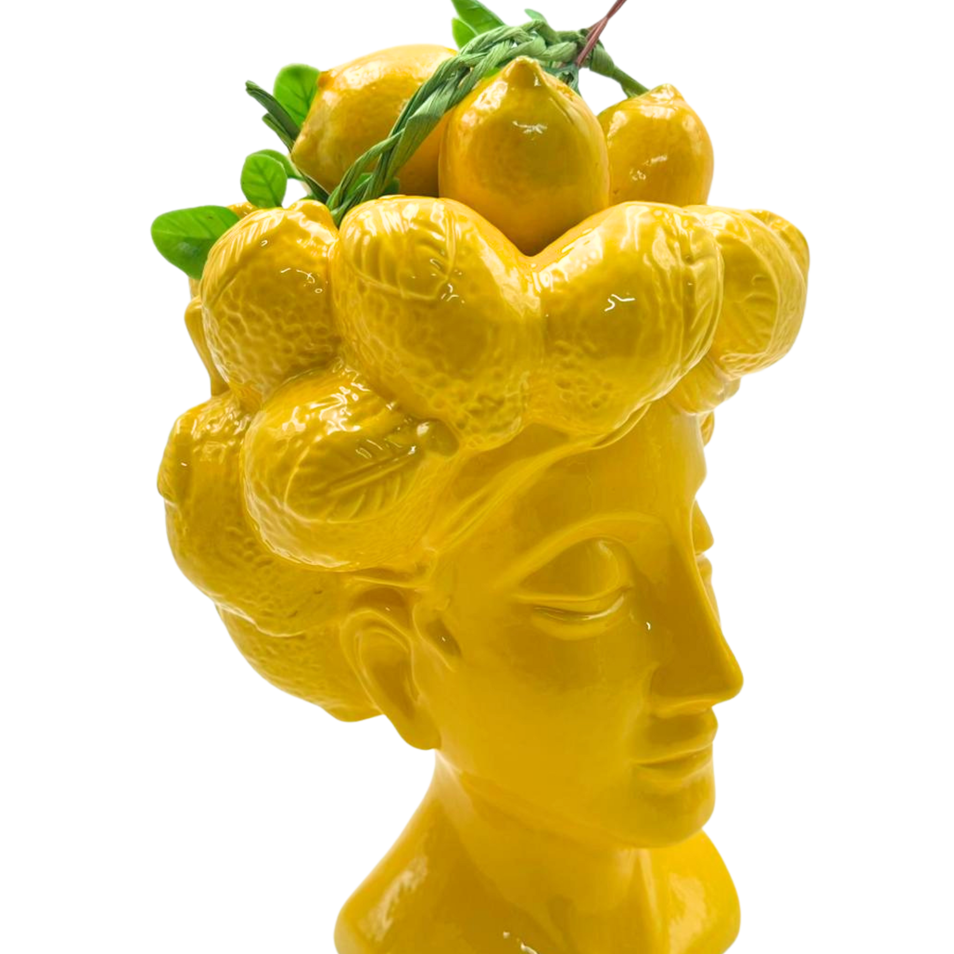 Porta a casa un tocco di Sicilia con la Testa di Moro Grande in Ceramica Gialla, un pezzo decorativo iconico e ricco di tradizione. Realizzata in ceramica smaltata lucida, questa testa femminile presenta un design elegante con dettagli scolpiti, tra cui la caratteristica acconciatura impreziosita da elementi agrumati che richiamano la cultura mediterranea.