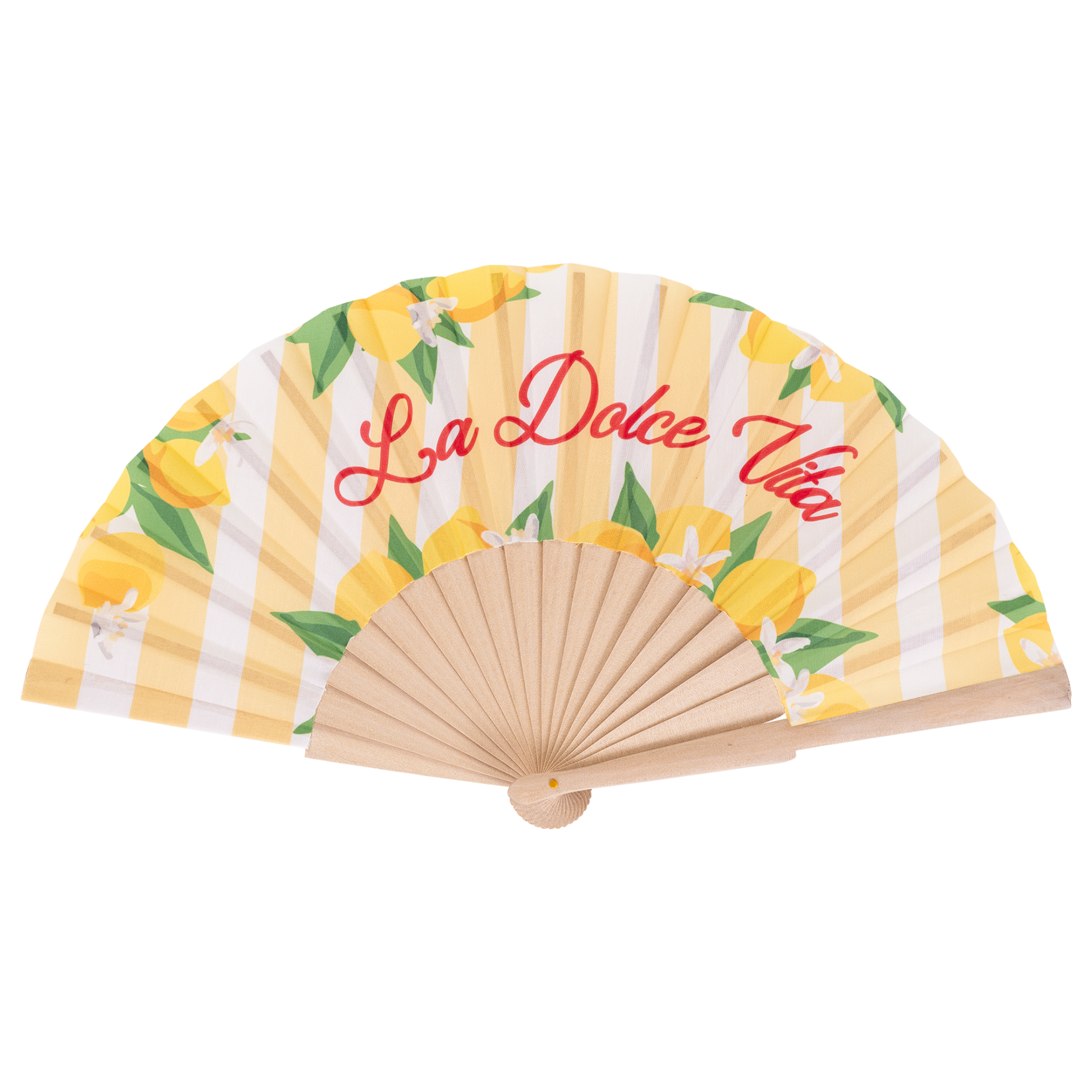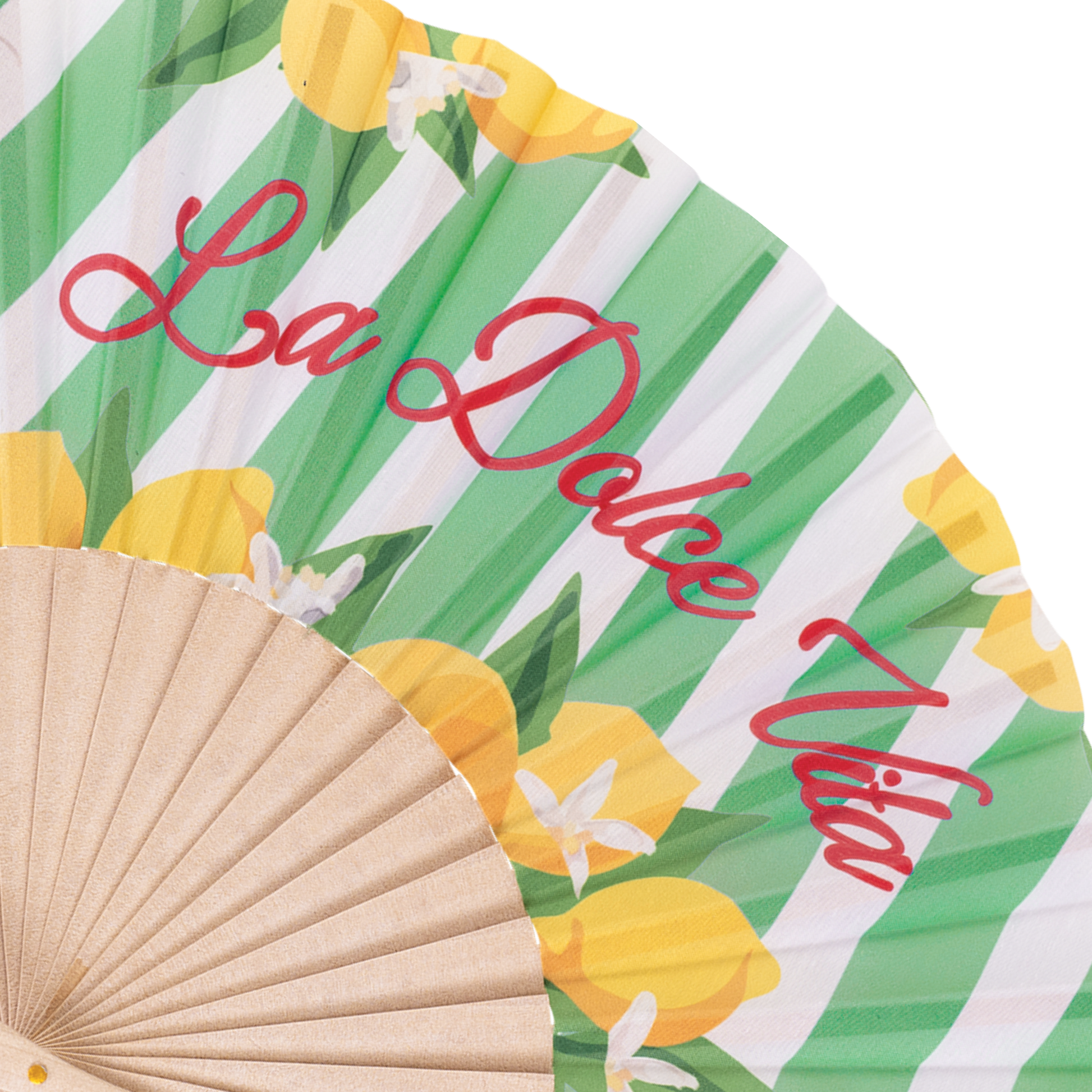 Lasciati trasportare nell’atmosfera solare e rilassata della Costiera con il Ventaglio Pop "La Dolce Vita Azzurro". Un design fresco e spensierato, con sfondo a righe bianche e azzurre e limoni vibranti, che richiama tutto il fascino dell’estate italiana. Perfetto per chi vuole affrontare il caldo con stile e ironia.