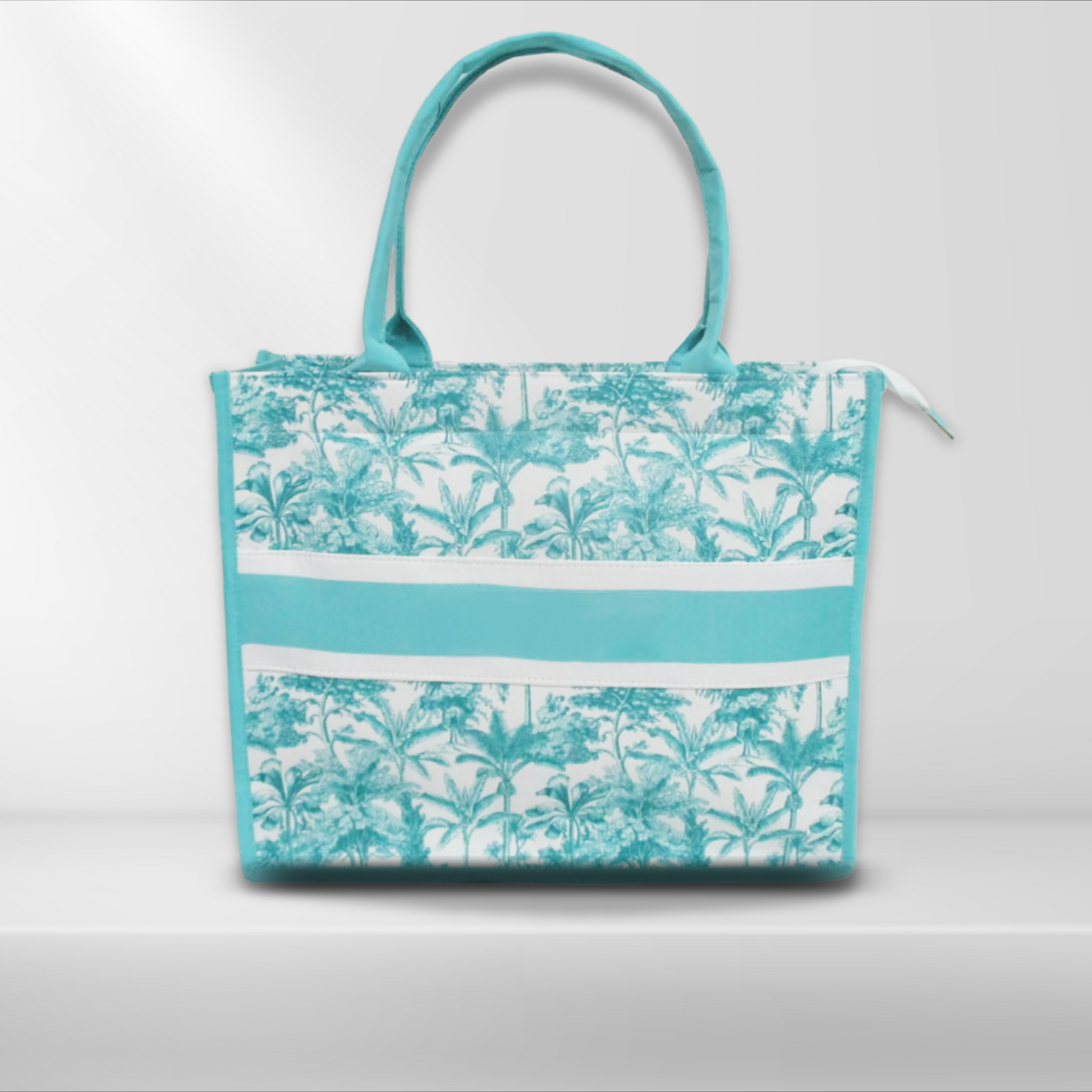 La Jungle Bag è un invito a viaggiare con lo stile e la leggerezza dell’estate. Il suo pattern tropicale in blu navy, con palme lussureggianti e dettagli a contrasto, la rende un accessorio dal carattere deciso ma elegante.