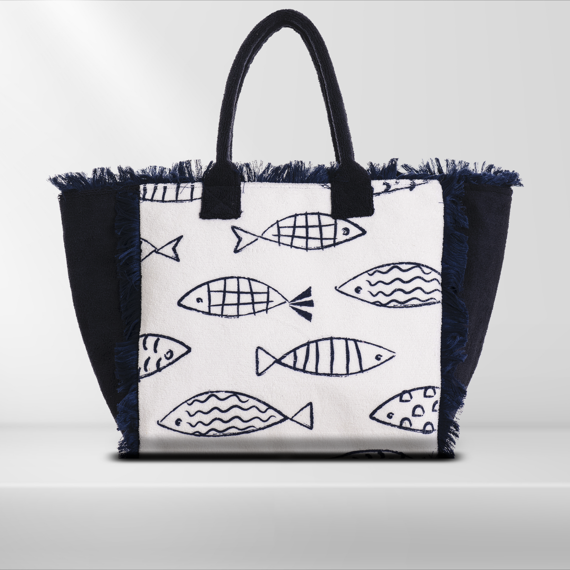 Con la Lisbona Bag porti con te l’anima del mare. Realizzata in morbida spugna con manici tono su tono e dettagli sfrangiati, questa borsa si distingue per la sua simpatica stampa con pesci stilizzati, che richiama lo spirito marinaro.