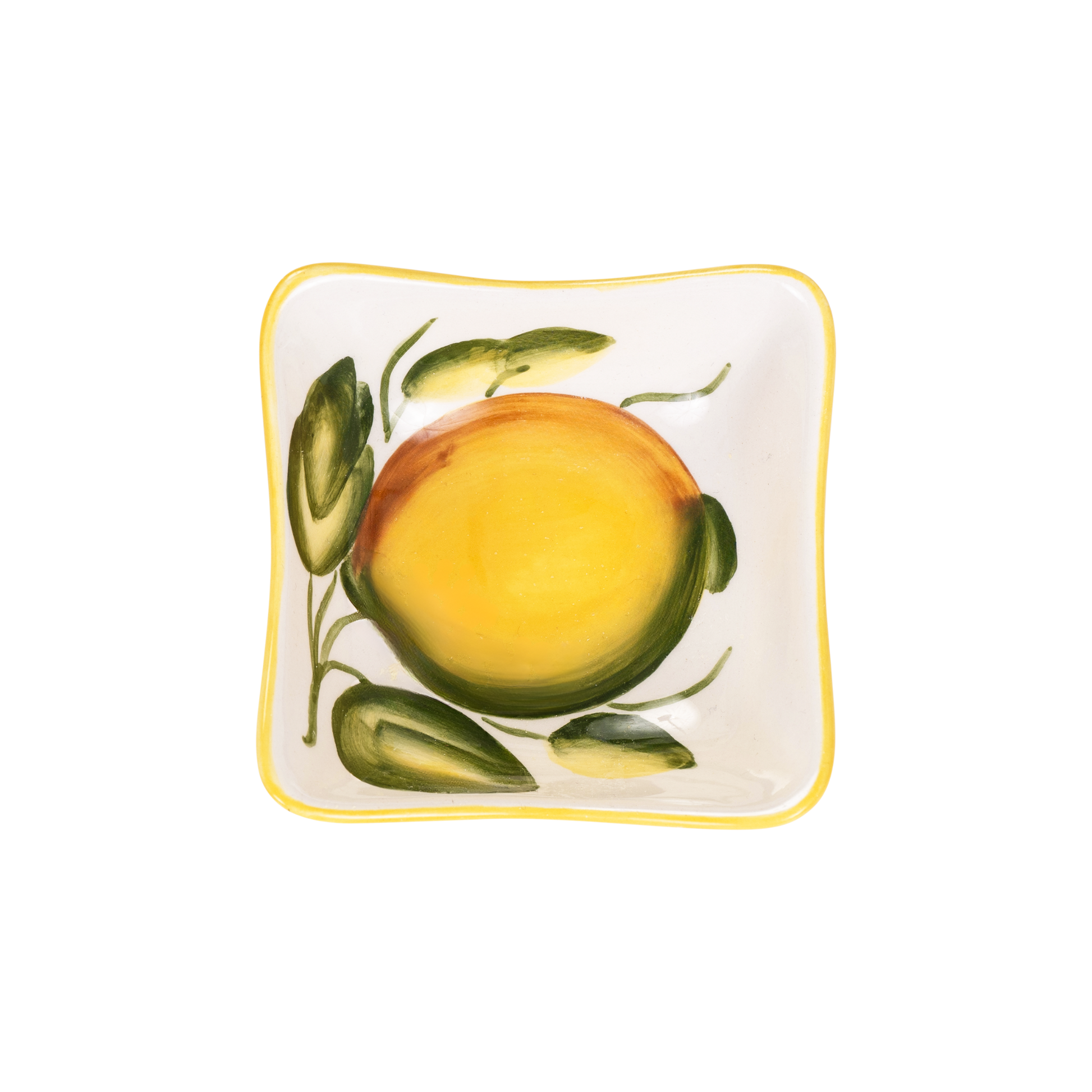 Una ciotola quadrata in ceramica dal gusto mediterraneo, decorata a mano con un grande limone e pennellate verdi. La forma morbida con bordi leggermente ondulati e il profilo giallo la rendono perfetta sia in tavola che come dettaglio decorativo in cucina. Ideale per servire snack, frutta secca, salse, contorni o piccoli dolci, portando colore e artigianalità in ogni occasione.
