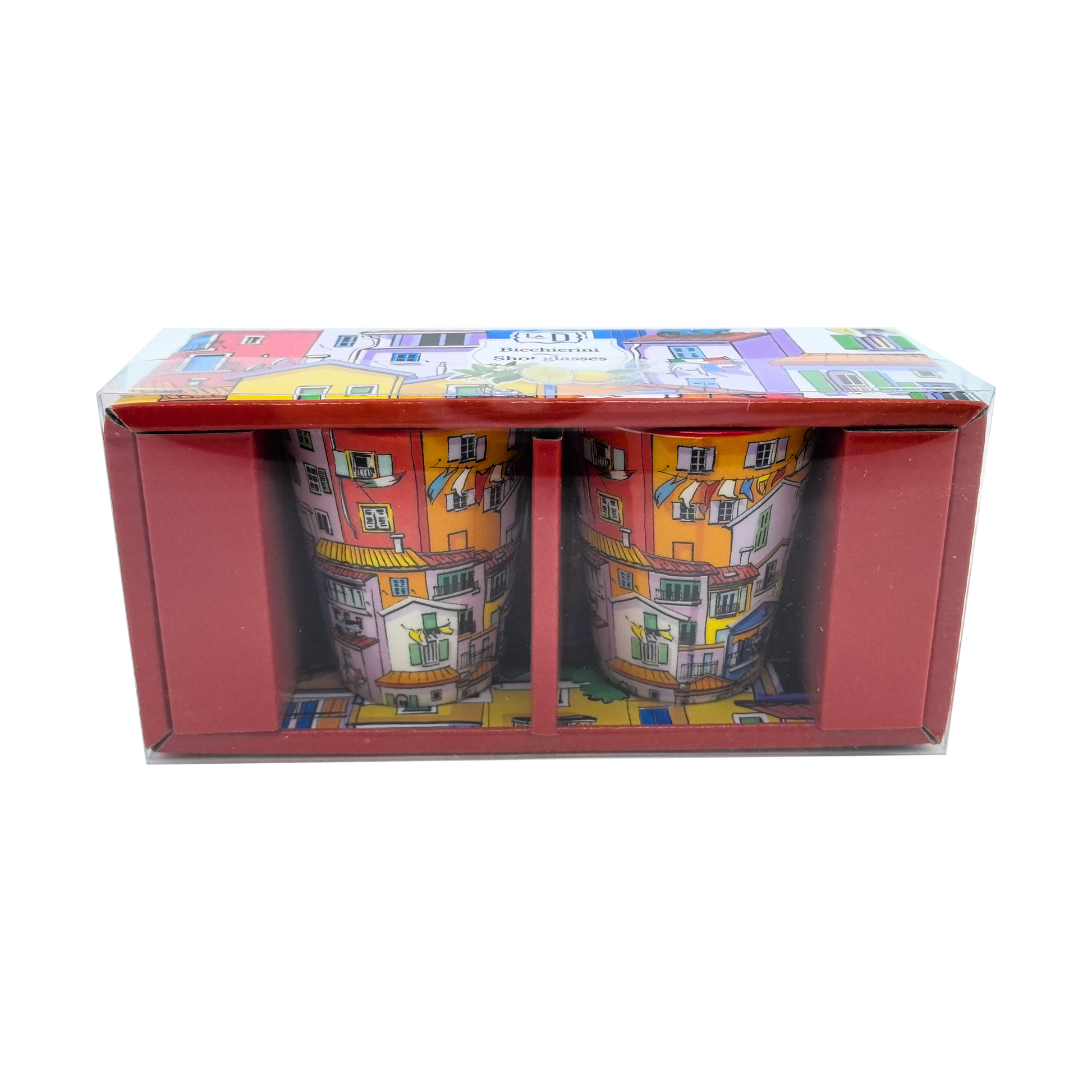 Porta in tavola un tocco di colore con questa coppia di bicchierini in ceramica decorati con la fantasia Tiny Houses: un mix di casette mediterranee e dettagli vivaci, perfetti per dare personalità alla pausa caffè o per servire amari e liquori. Il set è proposto in confezione regalo, ideale anche come pensiero per chi ama la ceramica decorata.