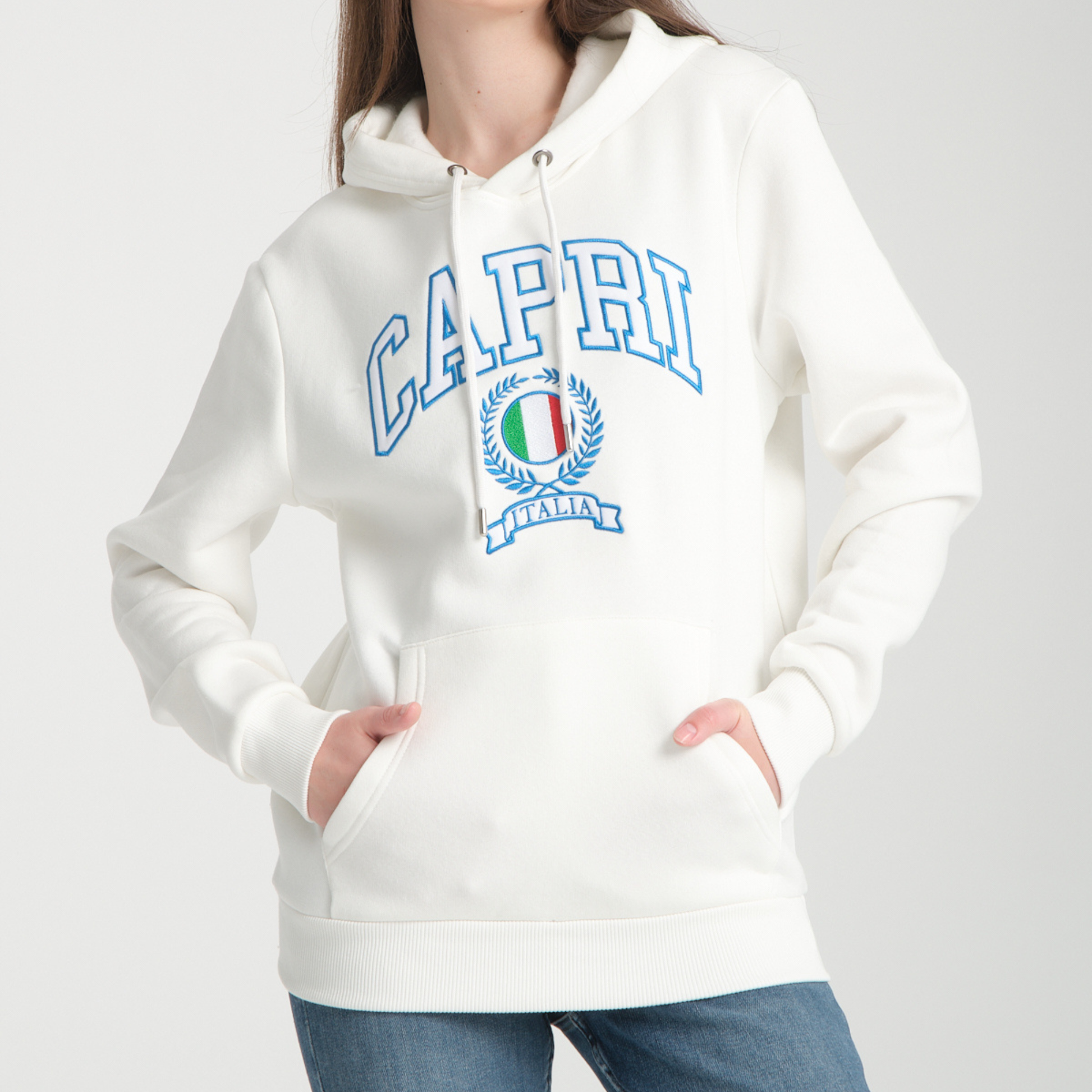 Il tessuto felpato all’interno garantisce calore e comfort, mentre il cappuccio regolabile con coulisse e la tasca frontale a marsupio aggiungono funzionalità e praticità. La stampa “CAPRI – ITALIA” sul petto dona un tocco sportivo e distintivo, perfetto per chi ama uno stile casual con carattere.