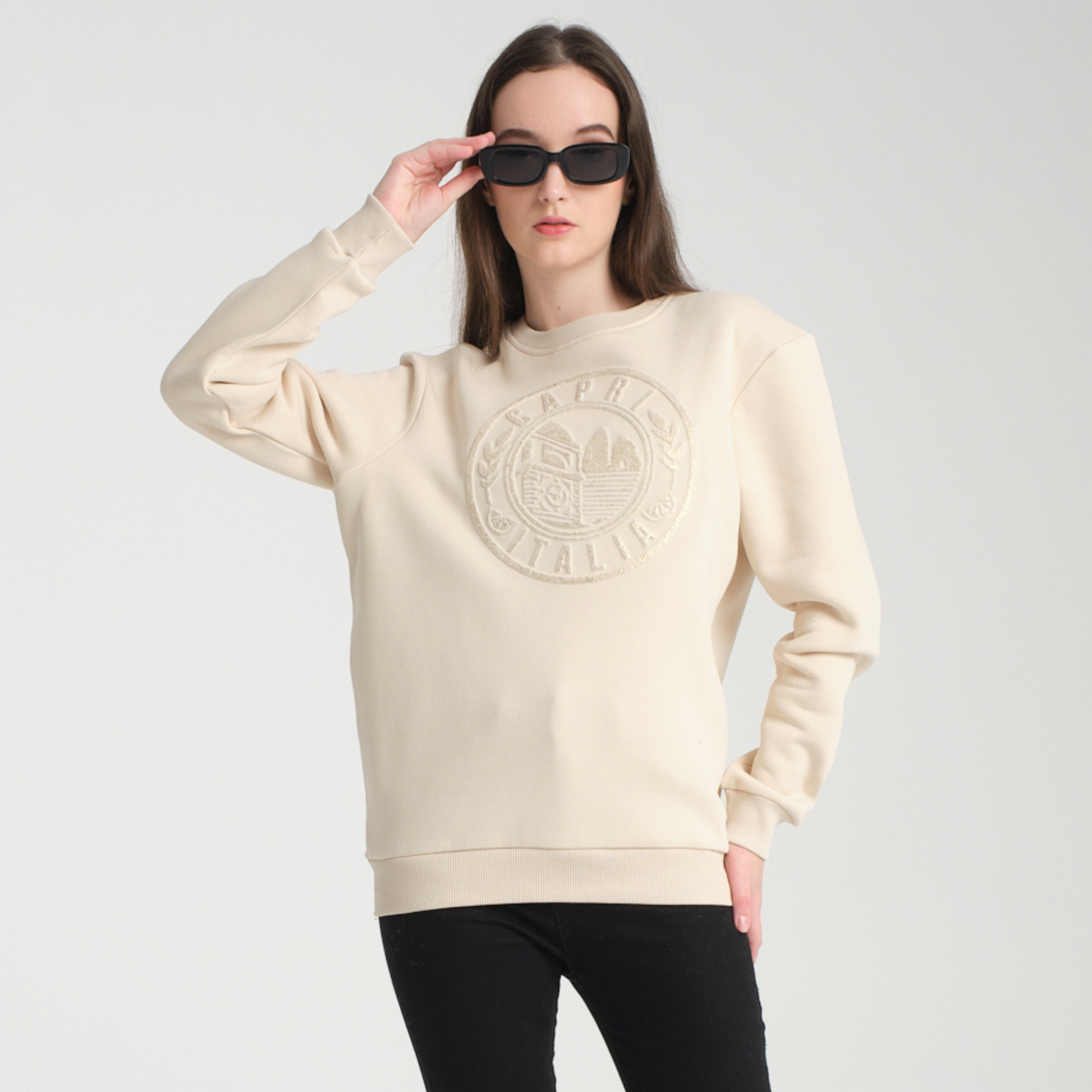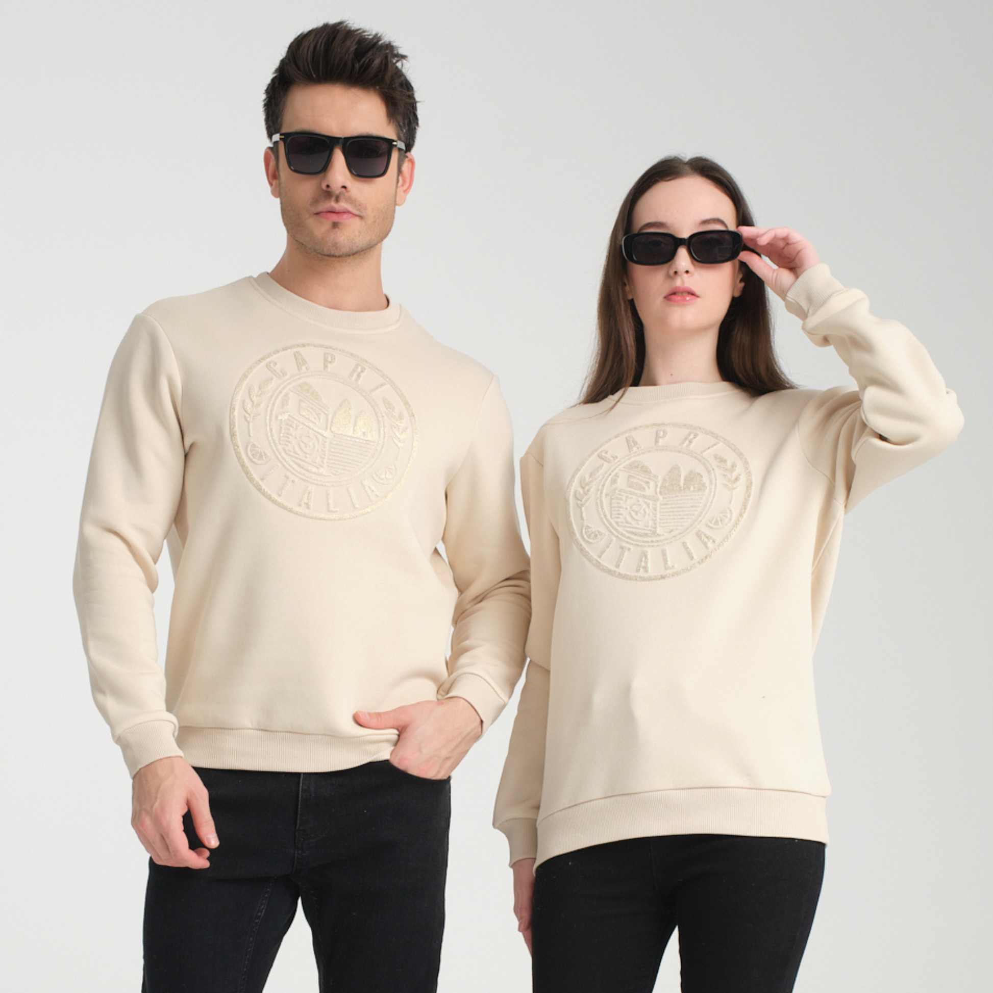 Il logo “CAPRI ITALIA” tono su tono, ricamato in rilievo sul petto, dona un effetto raffinato e moderno, rendendo questa felpa un capo iconico, perfetto per outfit casual o più ricercati.
