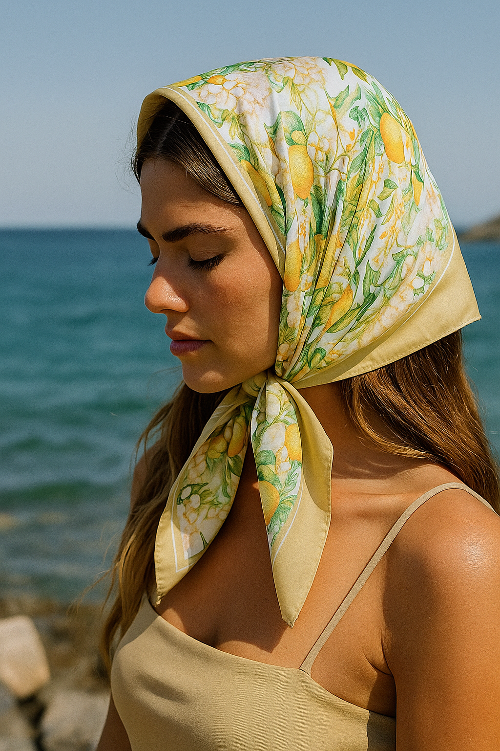 Con le sue dimensioni di 90x90 cm, questo foulard si presta a diversi utilizzi: indossato al collo, tra i capelli, come cintura o legato alla borsa. Un accessorio che unisce freschezza mediterranea e stile senza tempo.