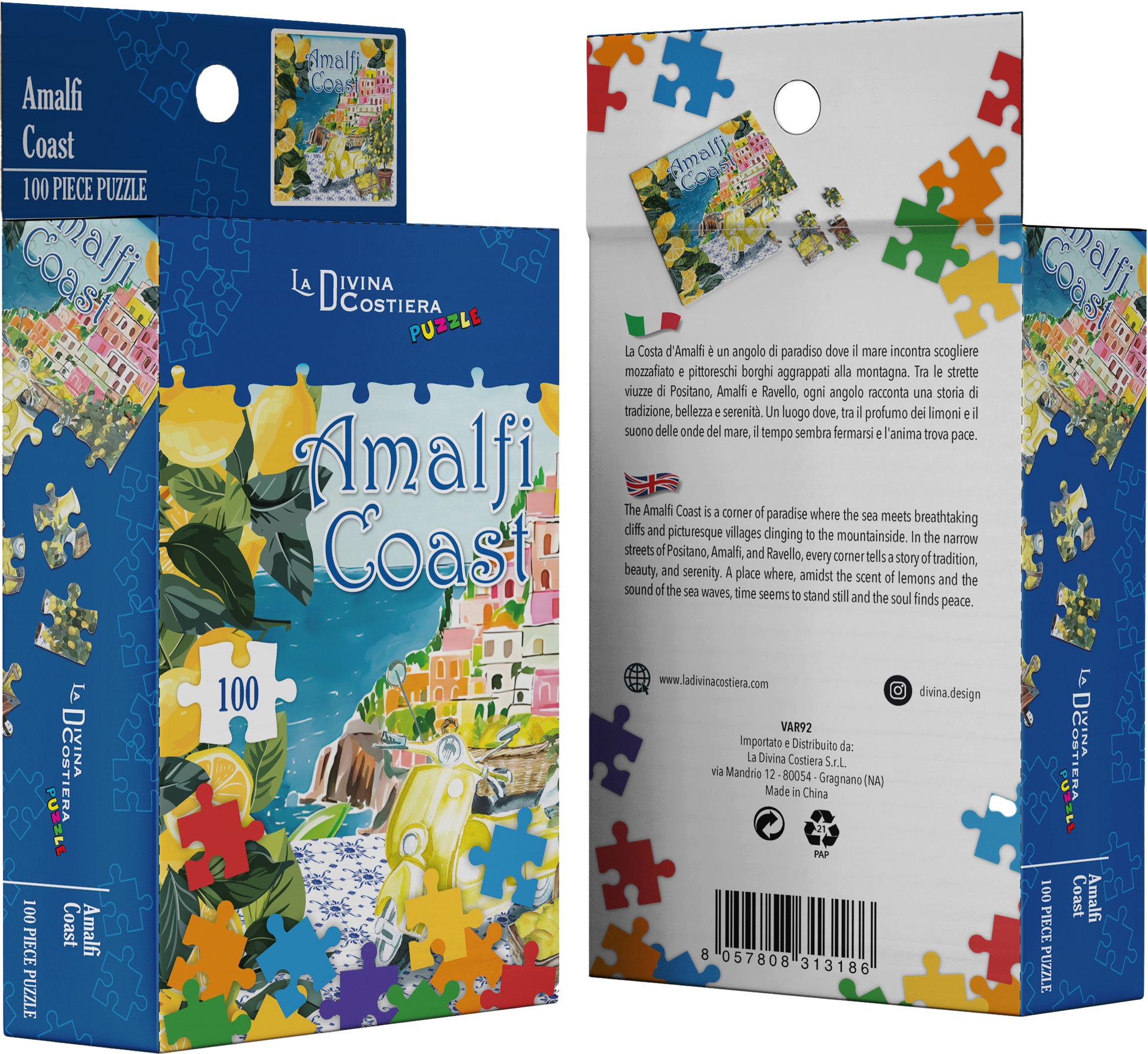 Scopri la bellezza di Amalfi con questo puzzle da 100 pezzi. Un piccolo viaggio tra paesaggi suggestivi, colori vivaci e dettagli che raccontano l’anima del territorio.