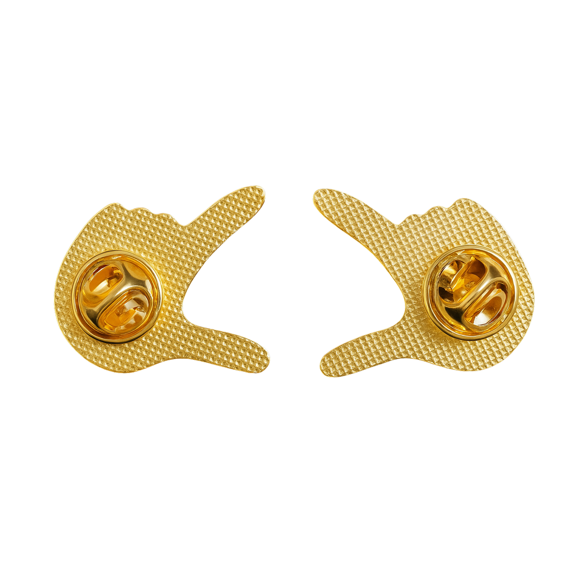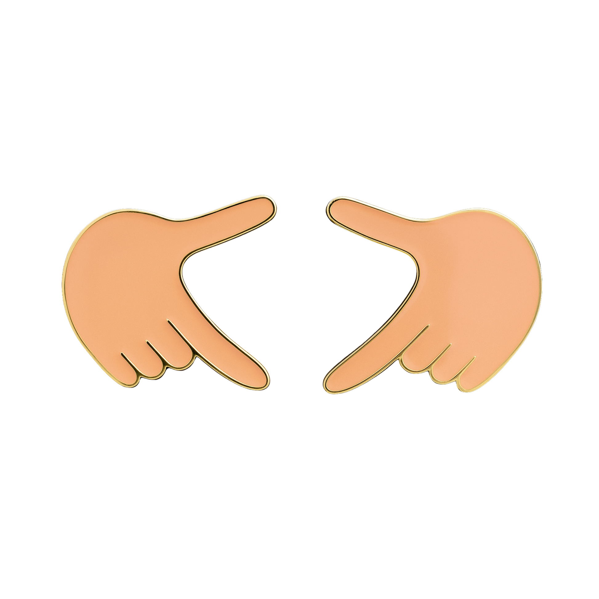 Le due mani, pensate per essere indossate insieme come gesto completo, sono stilizzate in modo moderno e pulito, realizzate in smalto color pesca con profilature dorate sottili che definiscono con precisione dita, contorni e movimento.