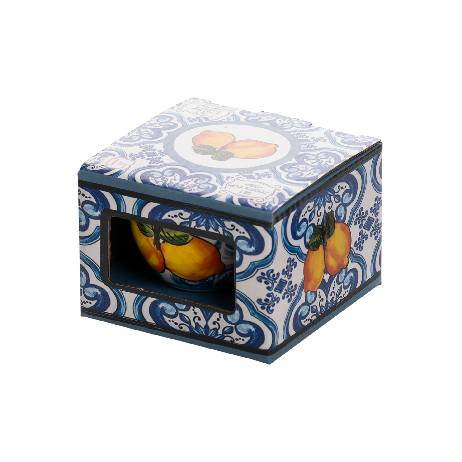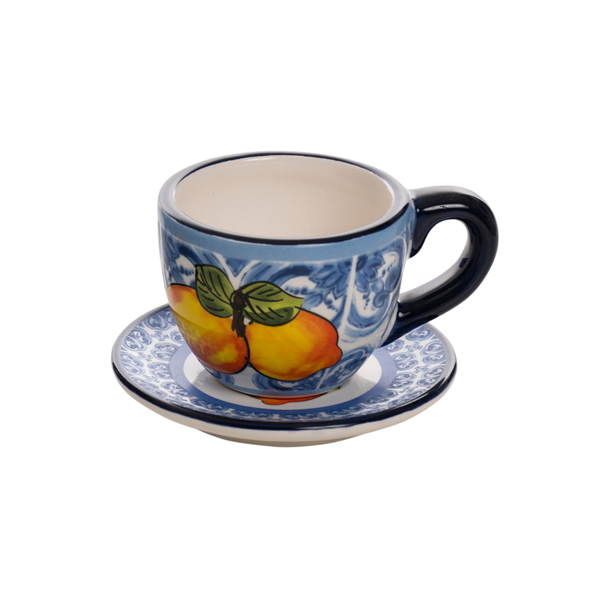 Il decoro in stile maiolica blu, arricchito dal vivace limone giallo con foglie verdi, richiama i colori e le atmosfere della Costiera. La tazzina è accompagnata dal suo piattino coordinato, creando un set raffinato e armonioso, perfetto per gustare il caffè con stile.